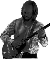 | Russ Haines, guitar. Russ has played many instruments professionally, from sackbut (a medieval trombone) to bluegrass banjo. Owning a 24-track post-production studio, author of Digital Audio, a book published in eight languages, and college instructor of courses in audio, video, and Internet streaming; he's a founding member of Severe Tire Damage, the first band on the Internet. |